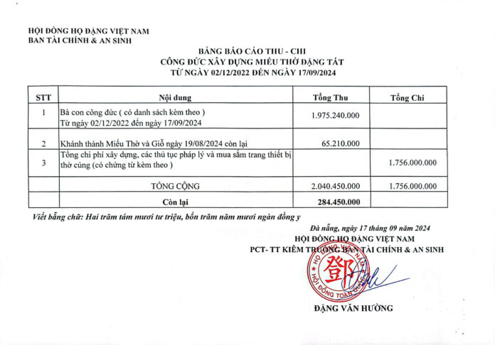 Hội đồng họ Đặng Việt Nam: Ban Tài chính và An sinh: Báo cáo Danh sách công đức xây dựng Miếu thờ Quốc công ĐẶNG TẤT từ ngày 02/12/2022 đến ngày 17/9/2024.